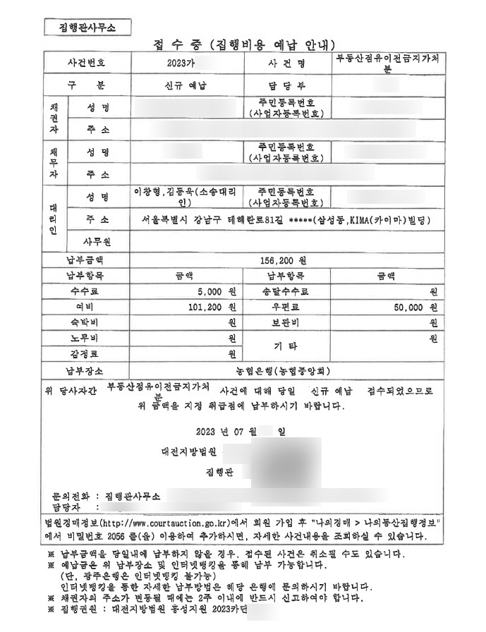 집행 신청서가 접수되면, 집행 비용을 납부하라는 접수증을 받게 됩니다. 당일 입금이 이루어지지 않을 시, 집행이 취소될 수 있음을 미리 고지하고 있으니 가급적 빠르게 납부해야겠지요!